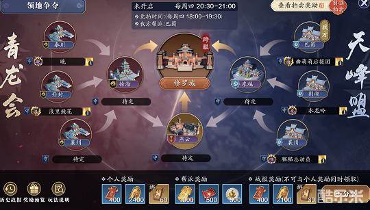 每周四18:00-19:30为领地竞拍时间,具有参与资格的帮派,可由管理消耗帮派资金进行出价。竞拍成功的帮派可参与领地归属争夺。不同类型地盘对应竞拍时间和要求如下: