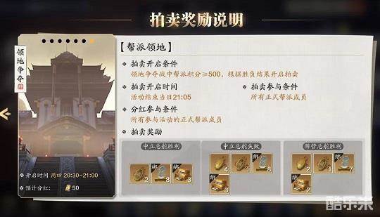 拍卖奖励:符合条件的帮派均可开启拍卖,符合条件的少侠可以参与拍卖、获得拍卖分红。