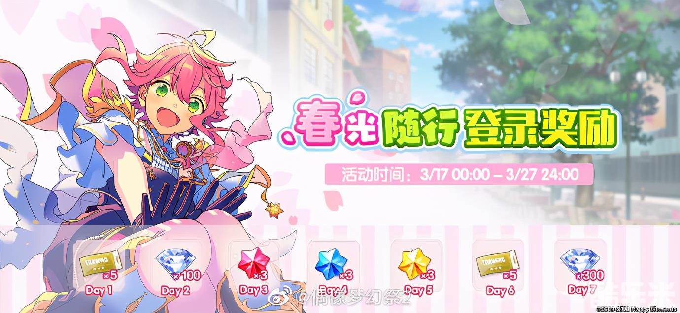 在这个浪漫春日,小偶像们因为制作人准备了惊喜。准备好和大家一起在合唱广场欣赏春樱翩翩吗?3月17日00:00~3月27日24:00,「春光随行登录奖励」开启,活动期间,每日登录游戏累计7天可领取【钻石】、【三色大宝石】、【经验券(大)】等丰富的春日礼物。