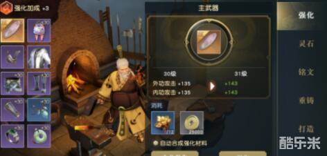 通过强化装备可以提升装备为我们带来的属性提升,当全身的装备强化到了对应的等级之后还能获得对应的奖励,进行装备强化的时候需要消耗的材料有:铁英、雨金、太阳之精、铜钱等,高级的强化材料可以通过低级的强化材料合成获得。