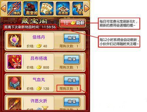 藏宝阁每隔12小时会自动刷新物品列表。小伙伴们也可以花费元宝主动刷新物品列表。