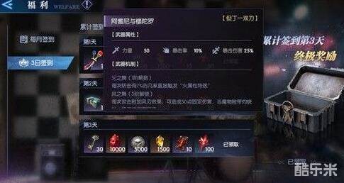 只要你完成得到的好东西肯定不少,其中也包含武器,前期武器还是非常重要的,大家还是尽量多获取一些吧。游戏中还加入了一个福利玩法签到,每天登陆游戏签到直接就能拿好东西了,签到后期也是可以获得武器的。
