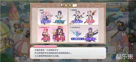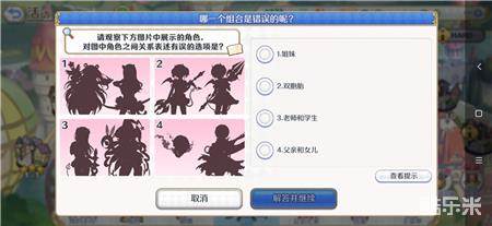 1的剪影是初音和栞,姐妹没问题;2的剪影是茜里和依里,双胞胎也没问题;4是忍和骷髅老爹,不知道骷髅身份的玩家建议去看看忍的【亡灵召唤】技能说明;3是伊绪和七七香,俩人没有特殊关系。所以答案是3。