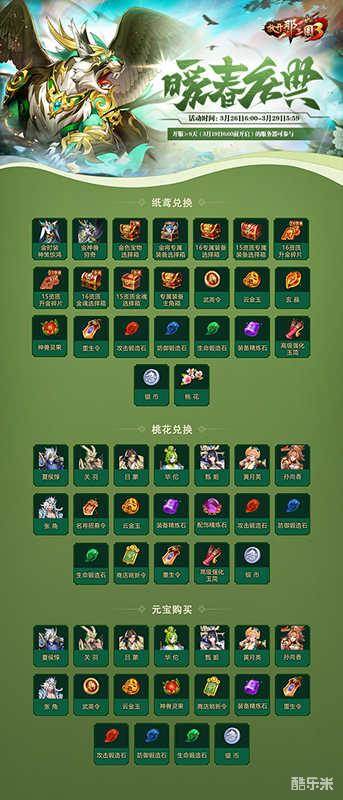 3月26日6:00-3月29日5:59期间,玩家参与暖春盛典活动可以获取道具「桃花」、「纸鸢」。「桃花」可用于兑换三国名将、武英令等多种稀有资源,强大阵容征战更轻松。「纸鸢」可用于兑换金色神兽-穷奇、金色时装-神策惊鸿、装备升金石等超值福利,大量属性增益、全新技能效果等让你如虎添翼!