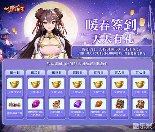 不仅如此,在3月26日6:00-4月2日5:59期间登录游戏,每天都能领取惊喜福利,超6000元宝、暖春定制称号-烟花三月和16资质武将选择箱等海量福利人人皆可带回家!