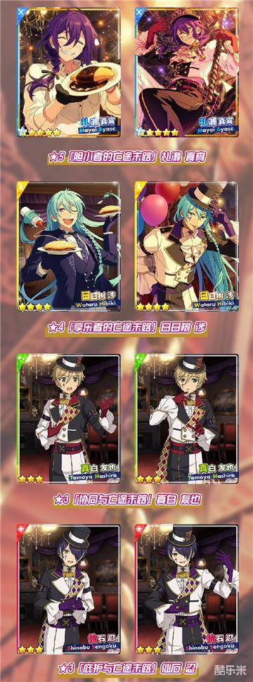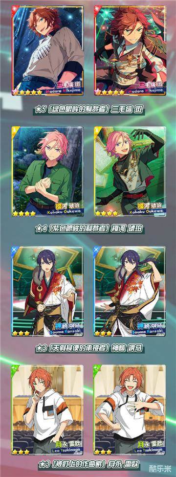 本期登场卡片为★5【绿色眼眸的制裁者】三毛缟斑、★4【紫色眼眸的制裁者】樱河琥珀、★3【天假其便的承接者】神崎飒马、★3【被盯上的作曲家】月永雷欧,这四张限定卡牌将在活动中与大家见面了,此次演唱会活动奖励卡片均附有MV服装及特殊演出。