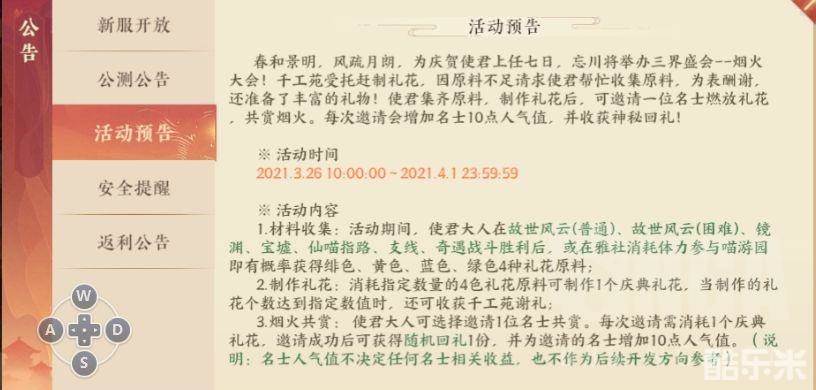 1.材料收集:活动期间,使君大人在故世风云(普通)、故世风云(困难)、镜渊、宝墟、仙喵指路、支线、奇遇战斗胜利后,或在雅社消耗体力参与喵游园即有概率获得绯色、黄色,蓝色、绿色4种礼花原料;