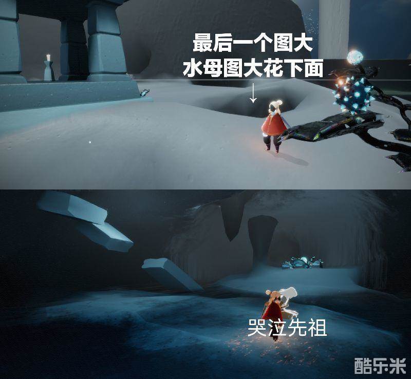 瑶鲲在最后一个大水母图有两个,第一个八人隐藏图出来下去;第二个躲猫猫先祖图直走到达大水母图在亭子下面。
