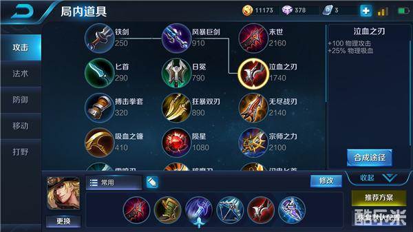 第一件先出末世,不仅增加马可波罗的输出能力,被动吸血效果也增加了他的线上续航能力。第二件出鞋子,如果对面控制英雄或法师较多的话出抵抗之靴,反之出影忍之足。第三件出纯净苍穹,增加他的输出能力和生存能力。第四件出破甲弓,这时敌方坦克和战士都有了一定的护甲值,破甲弓除了增加攻击力外,被动的护甲穿透效果让马可波罗能更有效地输出。第五件出泣血之刃,大量提升了马可波罗的续航能力,如果敌方有貂蝉、程咬金、东皇太一此类回血速度较快的英雄时,把泣血之刃换成制裁之刃,限制他们的回血速度。最后一件出无尽战刃,无尽战刃增加的暴击率和暴击效果让马可波罗的输出能力更上一层楼。如果我方处于劣势的话,最后一件出冰痕之握,不仅增强自身的生存能力,还能提高一技能的命中率。