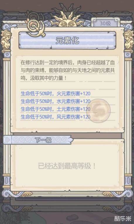 生命低于50时,火元素伤害+120,生命低于50时,水元素伤害+120.,生命低于50时,土元素伤害+120,生命低于50时,风元素伤害+120
