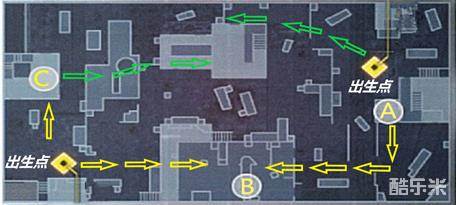 当然你也可以利用敌人的惯性思维,沿着绿色路线进攻C点或A点,这两个点位在游戏初期肯定疏于防守,即便你无法单人完成占领,也能扰乱敌人的正常进攻,让队友更快占领其他点位。