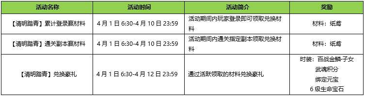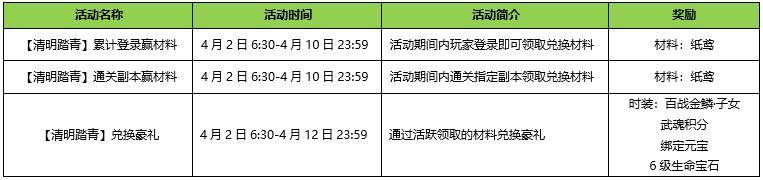 4月1日-4月12日正式服将分两批开启踏青活动,活动期间内每日登录游戏、参与特定副本即可获得丰厚奖励,欢迎英雄、女侠前来参与。>>>>点击下载游戏