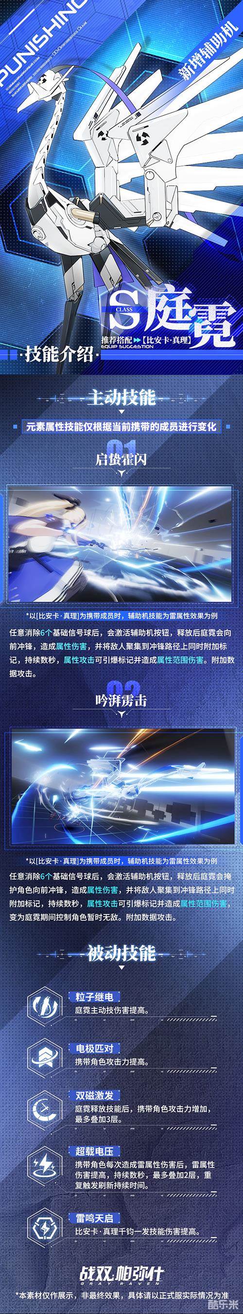 「庭霓」是《战双帕弥什》首名S级辅助机,其名取自雨中雷霆,雨后霓虹,用来形容它的银色翼翅,不仅能带来惊雷,也带来彩虹。骤雨过后,机械银鹤立在彩虹根处,轻捋尾翼,仿佛在宣告此乃自己造物。