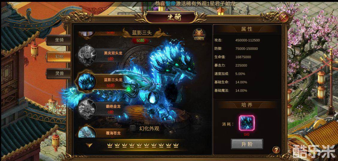 累计充值5000元:君临天下翅膀*2+三才屠龙神衣*2+坐骑幻化礼包*1+屠龙神石*999
