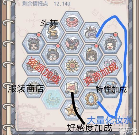上图中就是各个情报加点的作用及解释,我们可以根据自己的需要对希域的情报进行加点。