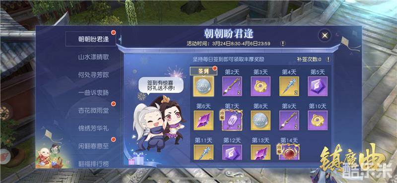《镇魔曲》“踏青寻春”庆典中,天命者们每天登陆游戏就能参与到“朝朝盼君逢”活动中,海量银币、各类稀有道具等奖励每天不重样,轻点手指就能领取!