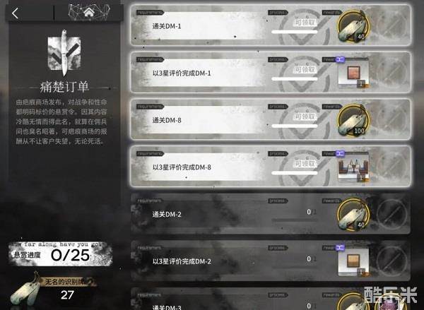 接下来看任务面板「痛楚订单」,能够获取活动干员铸铁。通过这些任务,我们能获取活动代币790枚。同时,首通关卡的任务被重置了,哪怕是之前已经经历过「生于黑夜」的博士,也要把DM-1到DM-8、DM-EX-1至DM-EX-6,以及突袭DM-EX-6都再通一遍。