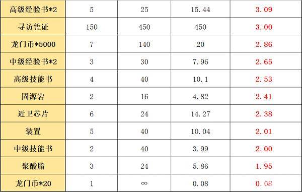 结论(优先级由高到低):聚合剂、酮凝集组、聚合凝胶、炽合金、RMA70-24、提纯源岩、初级经验书*2、高级经验书*2、寻访凭证、龙门币*5000、中级经验书*2、高级技能书、固源岩、近卫芯片等等。