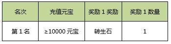 5. 单服排行榜第一名累计充值大于10000元宝,可以获得额外奖励转生石。