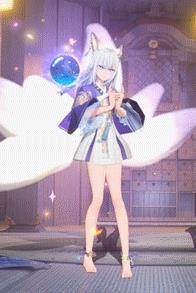 技能2【魂体转移】少女九尾轻盈跳跃,翻转身姿落在前方,落地后她原地转身,狐尾甩动,在眼花缭乱间投射狐球击打范围内的敌人。