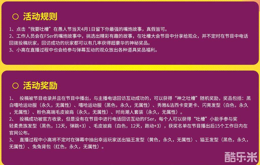 2.工作人员会在FSer的嘴炮故事中,挑选出精彩有趣的故事,在吐槽大会分享给观众,并且不定时在节目中电话回拨投稿玩家,回访成功的玩家都可以有几率获得超豪华的神秘奖品。