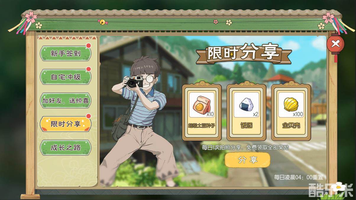 成长过程中别忘了给自己的小家留个影,解锁拍照功能后,通过拍照分享活动,分享照片给朋友们可获得超级土豆种子、饭团和金贝壳,成长基金又多了一笔~