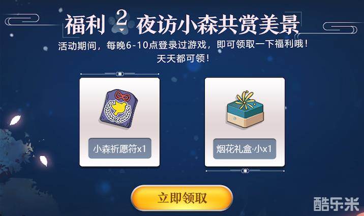 3月31日到4月15日期间,花音邀你与村民们一起欣赏小森村的夜景,看看星星每天也能有金贝壳和猫薄荷领?这种“一举多得”的事怎么可以不参加呢,而且连续登陆14天,就能获得小森祈愿符和烟花礼盒,快约上几个小伙伴一起在自家小屋前放烟花吧