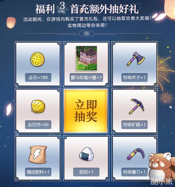 在欢乐庆典期间,在游戏内购买首充礼包,就能抽取珍贵大奖1次,奖到底有多大呢?浪漫的爱与玫瑰小屋包邮送到家,家的温馨感瞬间up up