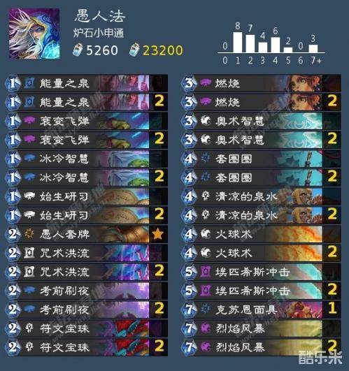 这套法师比较随机非常有意思,玩家通过过牌拿到愚人套牌,因为现在卡池比较浅,而高费法术质量很高,所以玩家大概率能够在低费回合打出高费法术,非常强。