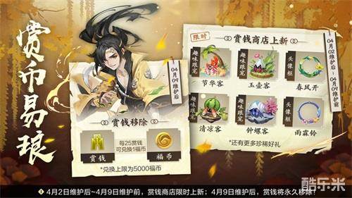 4月9日维护后,赏钱商店将永久歇业。赏钱将以25:1的比例转化为福币(兑换上限为5000福币)店内部分售卖物品将在其他商店中上架;同时游戏内赏钱产出途径将调整为其他货币。