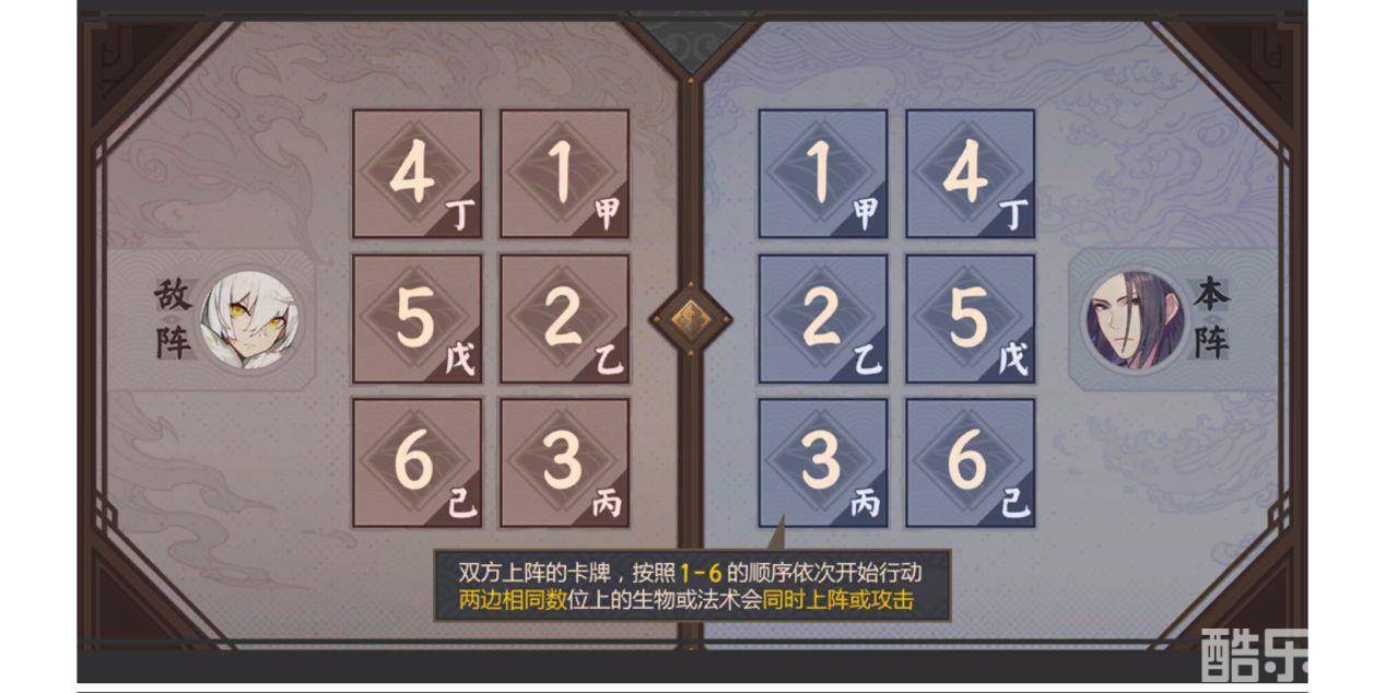 双方的卡牌结算严格按照甲、乙、丙、丁、戊、己的格子顺序同时计算,若该回合有使用英雄绝技的情况,则优先处理英雄绝技的效果。