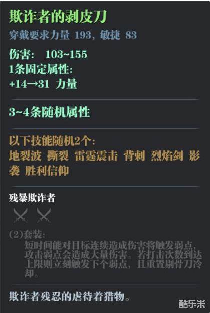 这里要注意的是,双刀看着是一次攻击砍了两次,但是一次攻击只触发一次刃之王刀光!!!所以刃之王对于欺诈者双刀,除了对着弱点多打1次,并没有针对双刀的任何加成了。大写的坑!