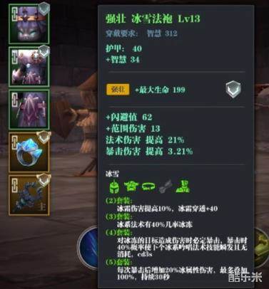 冰雪套。在于百分之百的暴击几率,所以基本出法就是黄字。但是要是说伤害加成冰雪套和蛇女套只多了百分之50。2件套的冰伤+10。穿透+40。但是冰雪需要5次才可以叠加到100得冰伤。所以提前你要能站得住,蛇女套石化+伤50。石化后+伤50,等于次次是100的伤害。毕竟普通攻击就可以挂石化状态。
