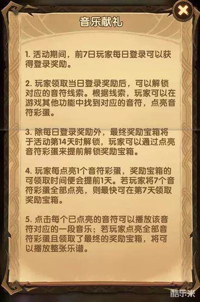 剑与远征音乐献礼怎么解锁?音乐献礼音符彩蛋线索在哪?游戏在近期开启了全新的音乐献礼玩法,该玩法为福利活动,玩家在活动期间登陆即可领取各种奖励,活动中的每日奖励都各有不同,7天之后还有大量的宝箱奖励,接下来小编就为大家分享一下该玩法的奖励大全。