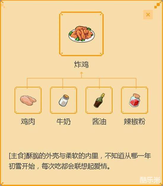 以上就是《小森生活》炸鸡配方解锁方法的全部内容了一抹清新明丽的夏日色彩,一次轻松愉悦的趣味冒险,全新的模拟类手游《小森生活》,以清新田园风格的画面场景,带你走进一个全新的世界,让你体验完美的生活,来一场不期而遇的浪漫邂逅!