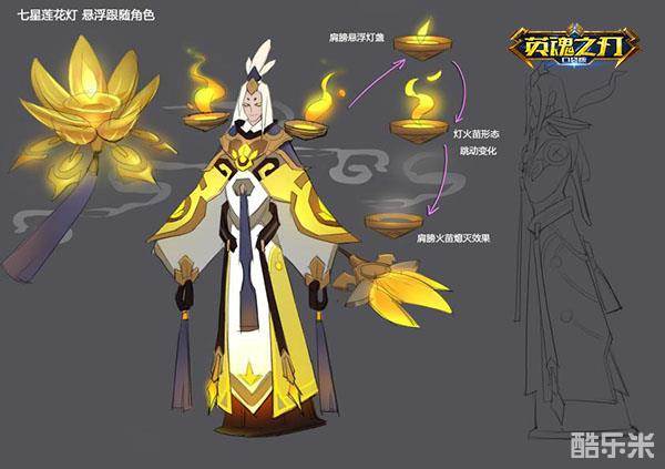 在造型外观上,新皮肤“玄玑启明”的配色使用能够直观体现光明、火光这类意象的黄白色;并将传统七星灯的造型拆解为“灯盏”、“莲花”与“烛火”三大元素,分别融入服饰的花纹、装饰、武器与技能特效中,在选择诸葛亮进行战斗时拥有更好的视觉体验。