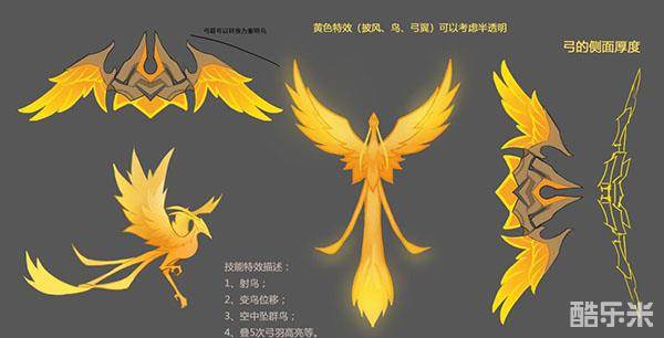 在外观配色上,另辟蹊径采用了淡紫色为主色调,金、黄为辅色调,让光明与优雅并存。在细节上,重明鸟、金羽、眼瞳等元素融入配饰,譬如英雄肩部的向上造型、羽翼形状披风,不一而足;在武器外形方面,后羿的金弓变成了几欲振翅的飞鸟形态,配合普攻与技能的特效,让玩家感受到重明鸟振翅高飞的奇丽视觉体验!