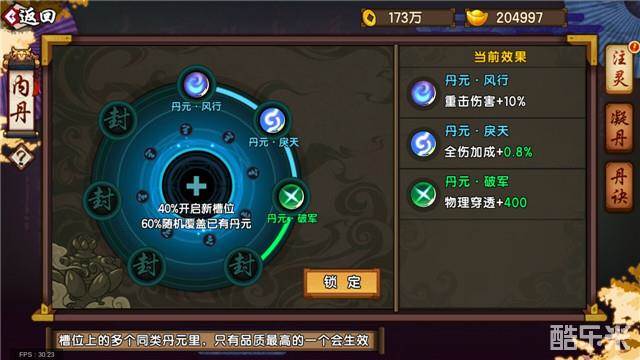 内丹中一共有七个槽位。玩家获得丹元后可通过注灵的方式将之注入内丹的槽位中。不同丹元加成不同属性,玩家在注入丹元后,将获得丹元属性加强。