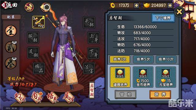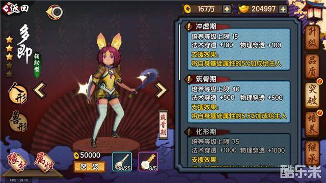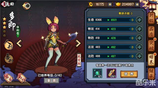 玩家消耗九转洗心丹可以进行培养。培养可以让玩家提升生命、物攻、法攻、物防、法防五项基础属性。玩家培养有属性上限,每次突破境界可以大幅提升上限。