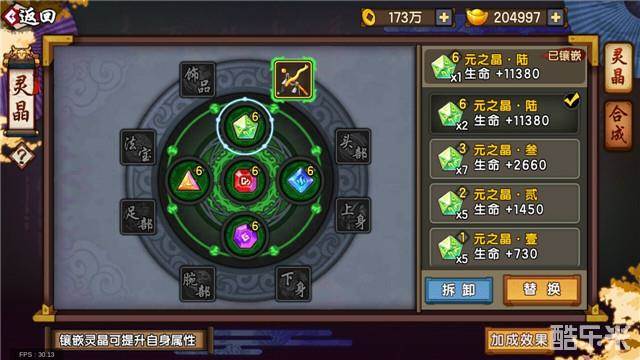 玩家在工匠处可对装备进行灵晶镶嵌。灵晶在游戏中主要通过历练-守护石灯获取,也可以在连环杀阵和盟会的兑换商店中看到其踪影。