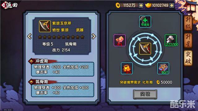 玩家需要用到矿石(生铁矿、寒铁矿、选铁矿)、升星道具(石髓、玉髓)、淬星之火、赤金以及指定装备来突破装备境界,每件装备突破境界后给予玩家的加成属性不同,玩家可视情况进行取舍。