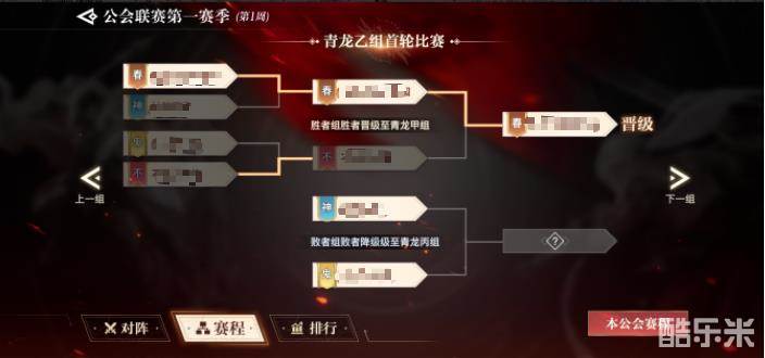 【联赛晋级】:青龙战区内分为甲乙丙丁4组,每组4个公会。每周2轮比赛后,根据战绩进行升降级,组内第1晋级上一分组,组内第4降级下一分组