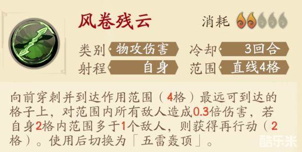 技能携带:【协心】、【五雷】/【风卷】、【奋力】/【克敌】