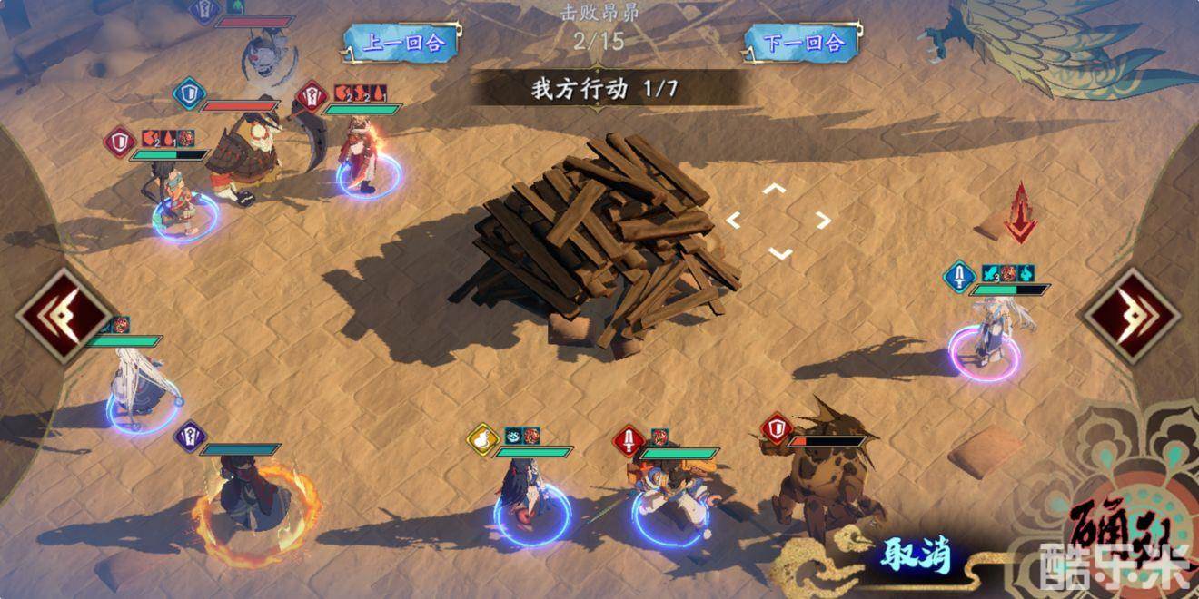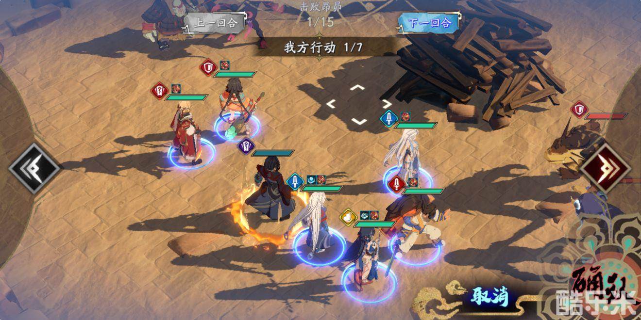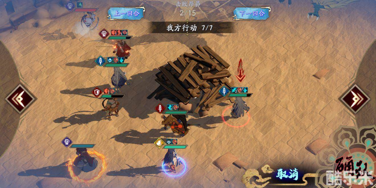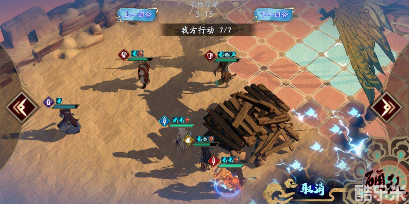 第1回合。白苑上前等待,冰璃加血普攻炎小怪,触发再动并对后面的小怪远程放幽剑。殷剑平普攻击杀雷小怪。依依上前卡位并减防暗小怪,夏侯仪技能攻击至残血(不要击杀,否则冰小怪攻击力过高)。冰璃向上走。