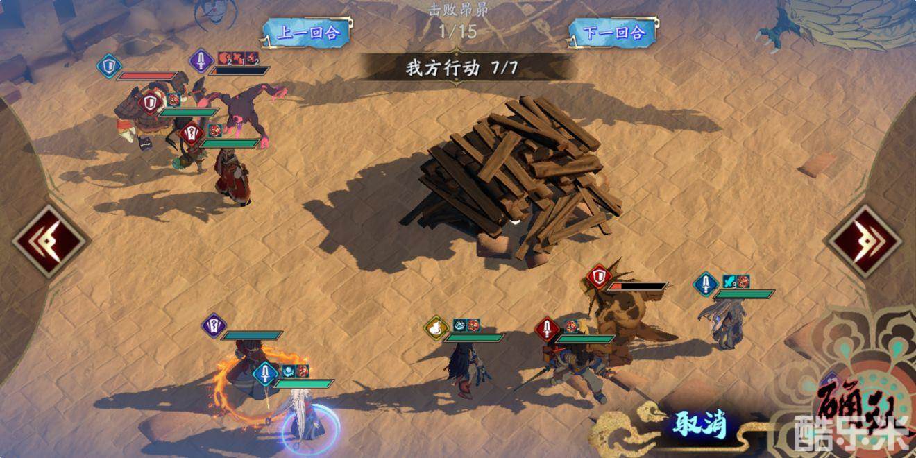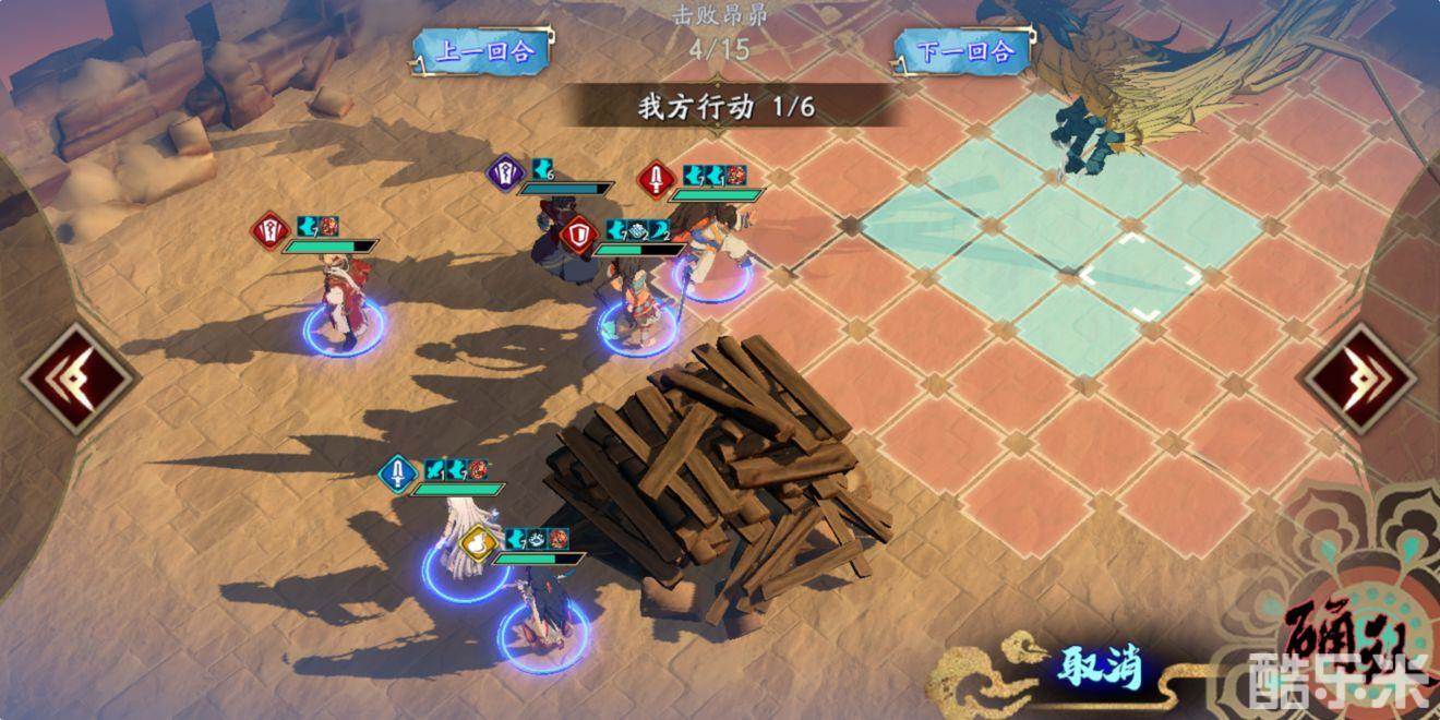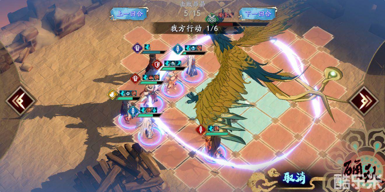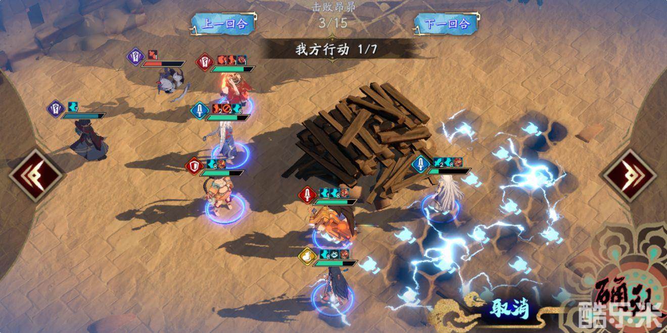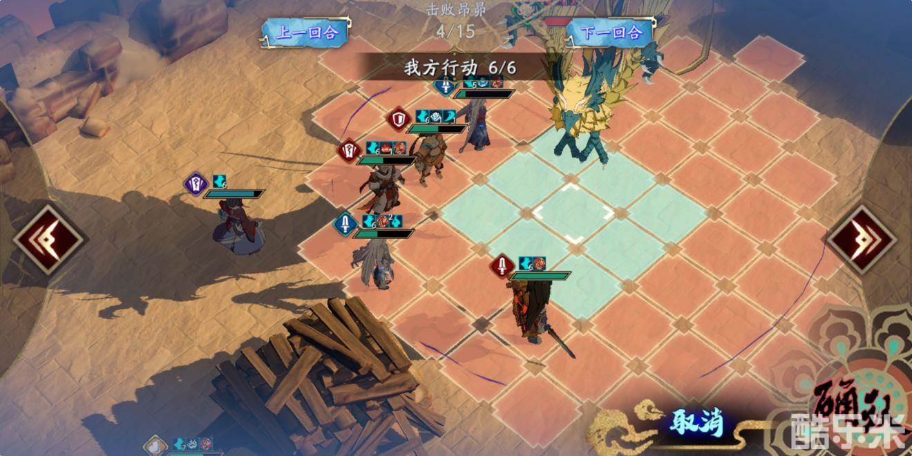 第5回合。殷剑平原地普攻,白苑原地放神氛群疗。自带的冰璃可以再动并用完夏侯仪的buff,造成第二次伤害之后被反击击杀。依依和夏侯仪普攻,最后剧情冰璃正好可以击杀。