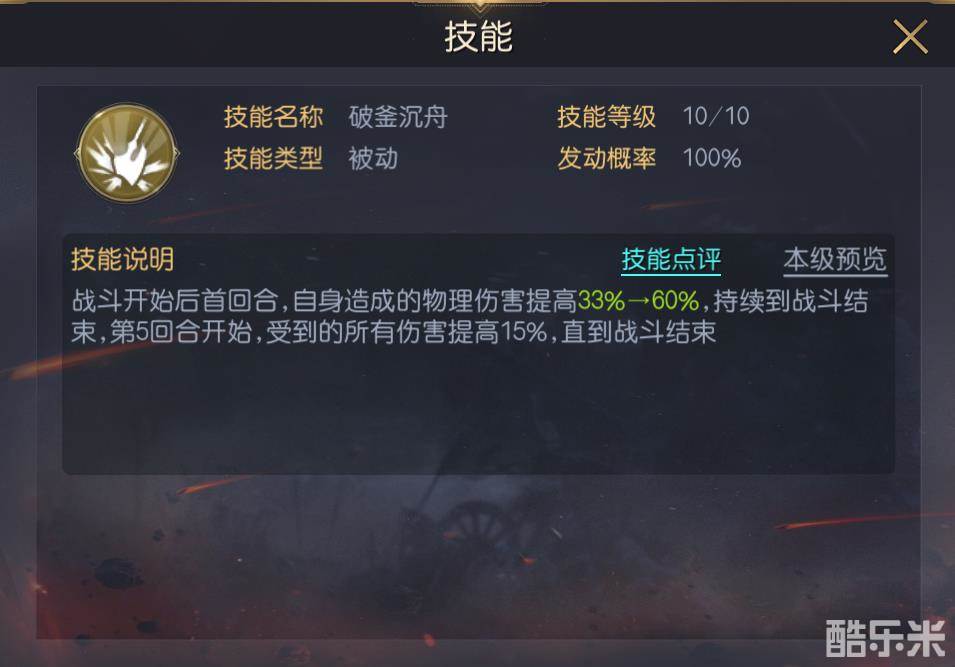 项羽的自带技能【破釜沉舟】,是一个百分百概率发动的被动技能,可以给自身一个伤害提升33%的增益效果,满级达到60%,该效果全程有效。但从第五个回合开始,项羽受到的所有伤害会提升15%,直到战斗结束。