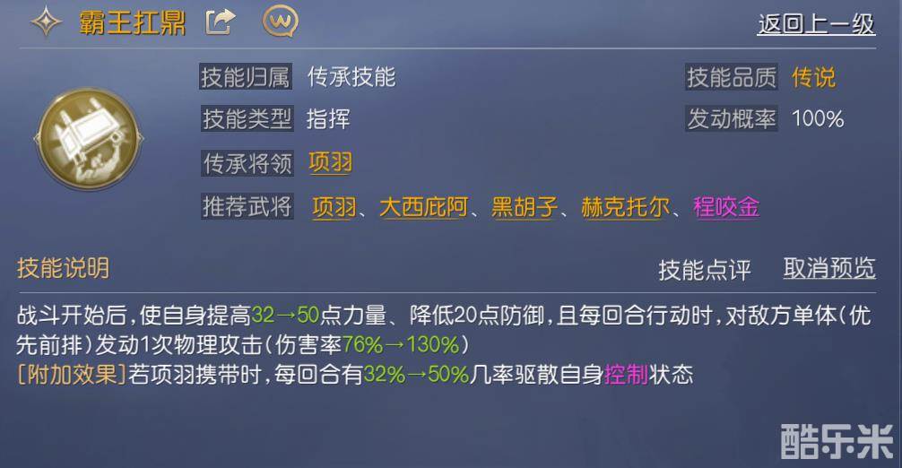 【霸王扛鼎】这个技能完美契合项羽,不仅有50的力量提升,每回合行动时都可发动1次物理攻击,最重要的是每回合都有概率驱散【控制】效果,极大的提升了项羽的输出效率,虽然会降低自己20点防御,但性价比非常高。