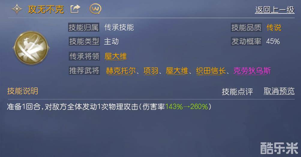 【攻无不克】没有额外效果,但发动后可造成260%的全体伤害,配合上项羽高额的力量属性与物伤加成,最终的实际伤害会远远超过这个数值,用于爆发最好不过。