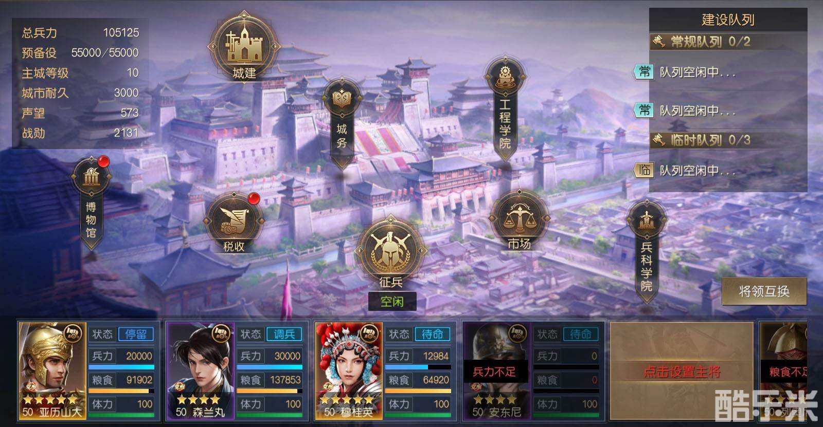 当玩家将内政厅升到4级之后,这里推荐大家将点将台升1级即可,因为在前期,大部分玩家只能培养一队主力,1级点将台即可保证主队上阵三名将领;兵役所点到3级就能够满足前期征兵的需求,而且兵役所的升级优先级并不很高,五本之前点1到2级即可;营地开荒阶段不点。