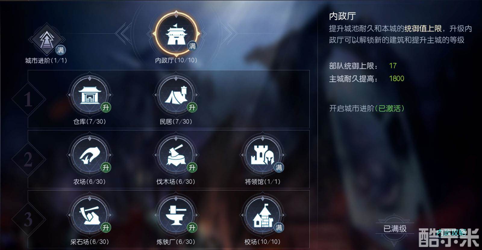 在这还要提醒大家一点,在留够征兵所需资源的情况下,升级内政厅等级的优先度也是很高的,基本就是能升就升,毕竟内政厅每升一级就能解锁新的城建科技。